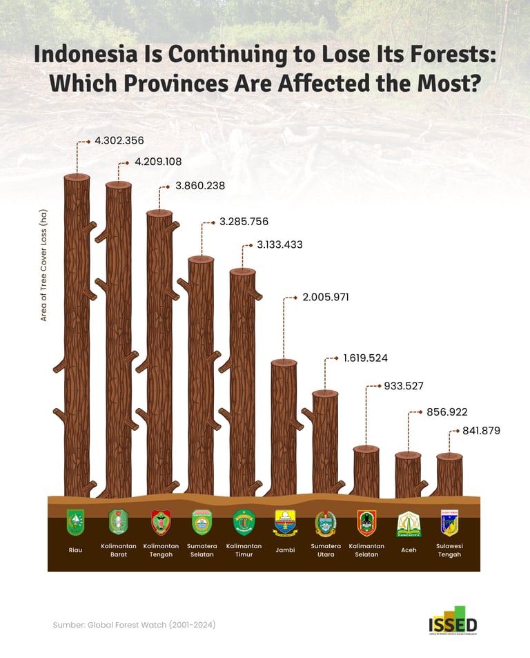 According to data from Global Forest Watch (GFW), Indonesia has lost around 20% of its total tree cover between 2001 and 2024. The highest accumulation of tree cover loss has been recorded in various provinces such as Riau, West Kalimantan, and Central Kalimantan. In fact, this region is known as the center of lowland tropical forest ecosystems that store large carbon reserves and are habitats for various endemic species.