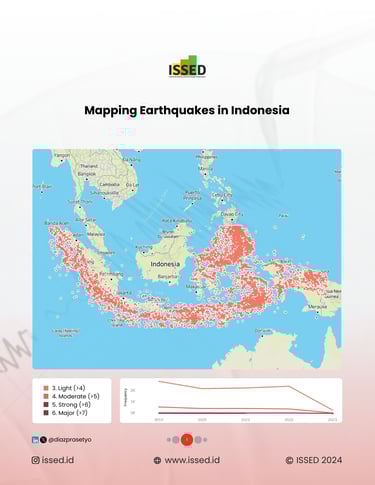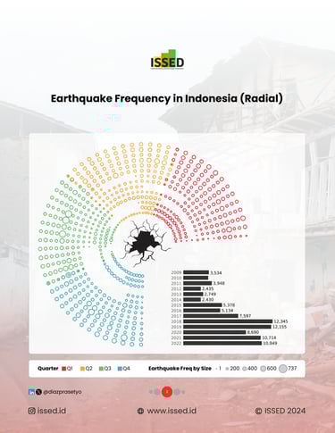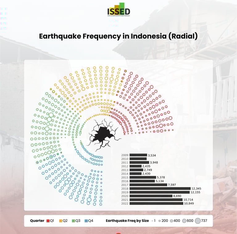 This "Earthquake Frequency in Indonesia (Radial)" dashboard provides an innovative and detailed visualization of earthquake occurrences across the Indonesian archipelago from 2009 to 2022. This interactive tool uses a radial chart to illustrate weekly seismic activities within each year, effectively mapping out the temporal distribution of earthquakes. Each circle in the radial layout represents a week. The size of each circle represents the number of earthquakes that occurred each week, with bigger circles showing a higher frequency, making it easy to identify periods of high seismic activity.