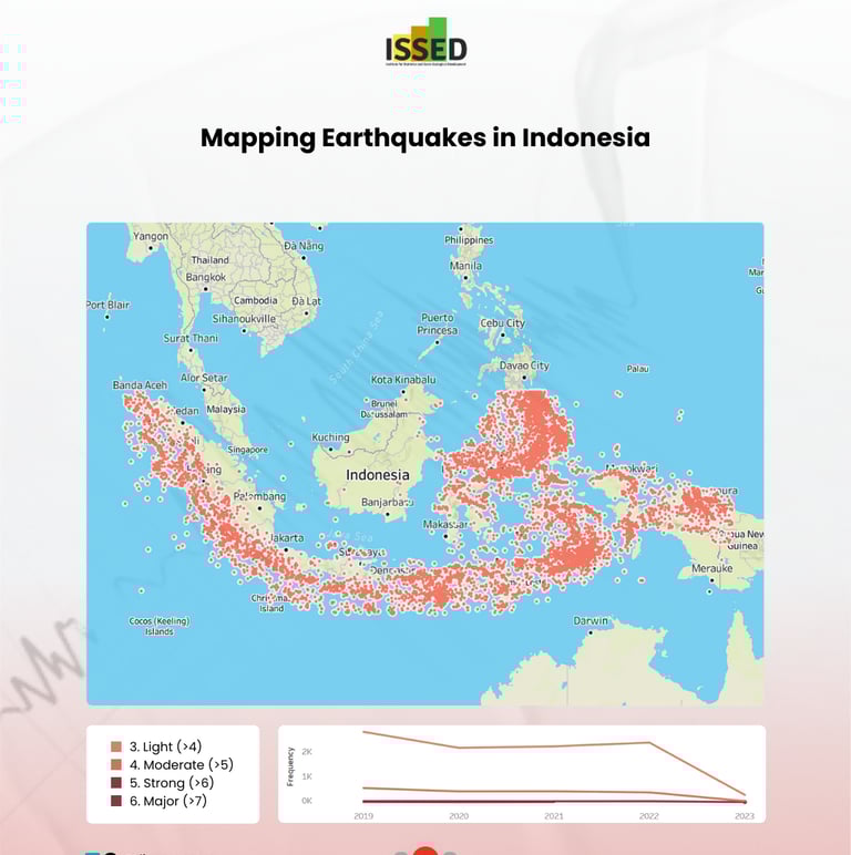 After seeing the frequencies throughout each year, it is also important to identify the magnitude and location of each earthquake. This "Earthquake in Indonesia" dashboard provides an even more granular look at the seismic challenges. It employs a map to pinpoint the locations of earthquakes across Indonesia, color-coded by magnitude, ranging from light (magnitude 4+) to major (magnitude 7+). This mapping is crucial for identifying specific regions where infrastructure needs to be built or reinforced to withstand potential seismic impacts. Accompanying the map, a frequency graph delineates the number of significant seismic events over the years 2019 to 2023. The line graph indicates fluctuations in seismic activity, with peaks suggesting periods of increased tectonic movement. This trend data is essential for scientists and policymakers alike, as it assists in predicting future seismic activity and planning for emergency responses and resource allocation. The graph's visual simplicity complements the detailed map, providing a clear, at-a-glance understanding of temporal seismic patterns.