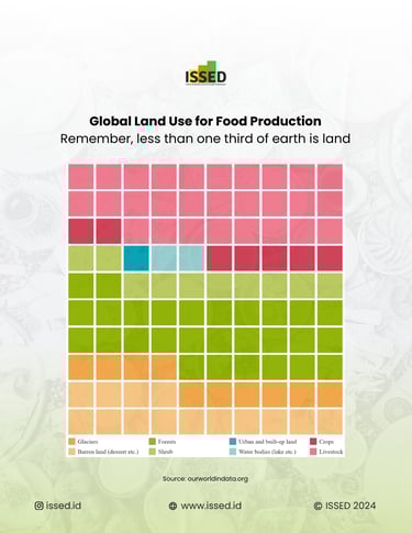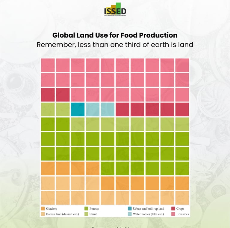 In contrast, smaller portions of the land function as forests (green squares), barren land (orange squares), and water bodies (blue squares). Forests, while not directly related to food production, play a crucial role in maintaining ecological balance and supporting biodiversity. Barren lands, which include deserts and other unproductive areas, do not contribute to food production but are important in understanding the limitations of arable land. Urban and built-up areas, represented by the dark blue squares, show the space taken up by human settlements and infrastructure, which further competes with land available for food production.