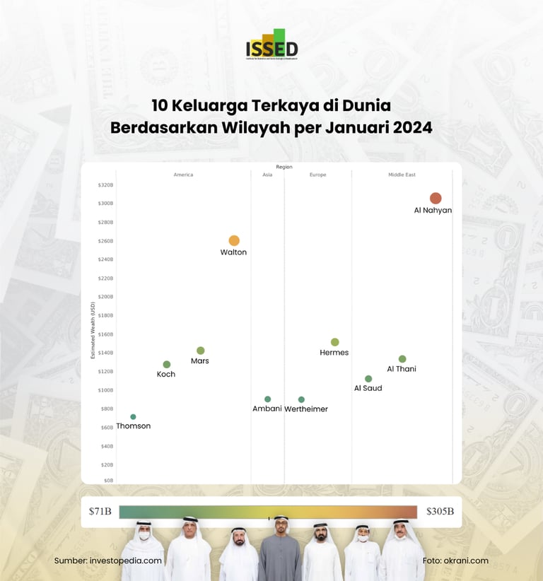 Jika dilihat lebih dekat, grafik ini menunjukkan konsentrasi kekayaan geografis yang jelas, dengan keluarga Al Nahyan di Timur Tengah berada di puncak grafik. Keluarga-keluarga terkenal lainnya termasuk Walton, Koch, dan Mars yang semuanya berada di Amerika, masing-masing dengan posisi keuangan yang besar. Ada pula keluarga terkaya di Eropa, seperti Hermes dan keluarga kerajaan Al Saud di Timur Tengah, yang juga menggambarkan kekuatan ekonomi yang signifikan. Representasi visual ini menggarisbawahi distribusi kekayaan global diantara segelintir orang terpilih, memberikan wawasan tentang pusat-pusat kekuatan ekonomi regional dan pengaruh keuangan mereka.
