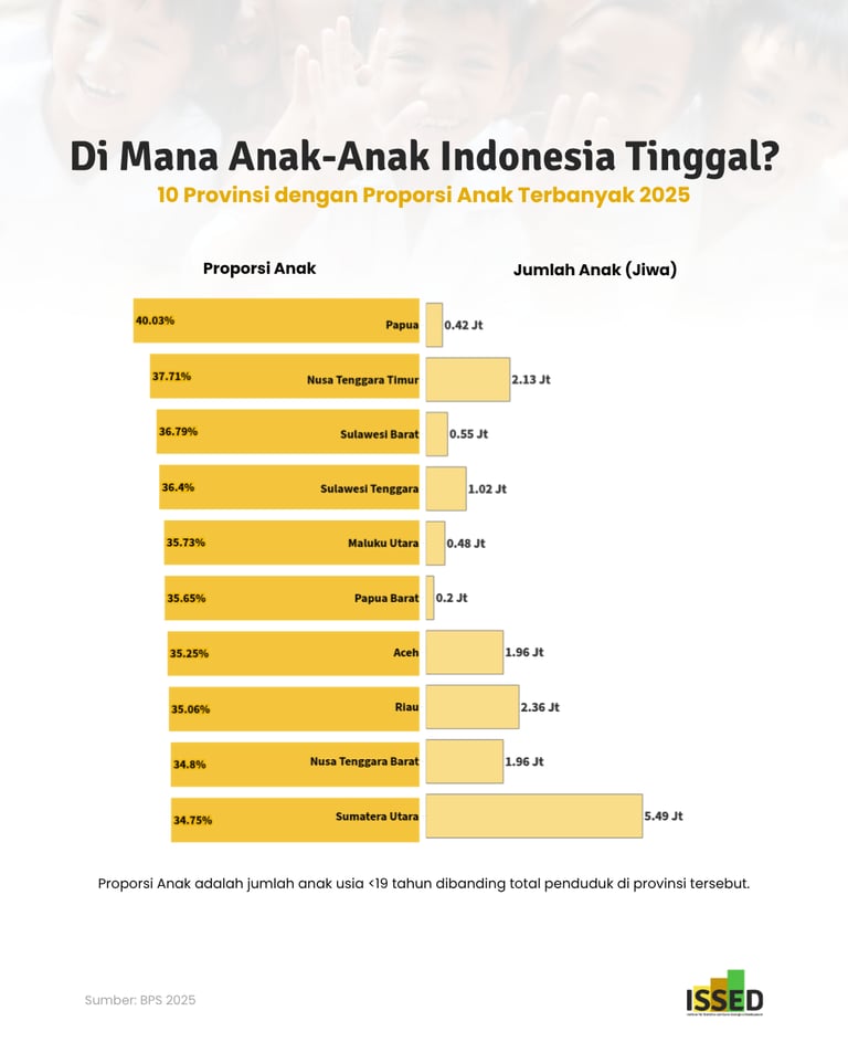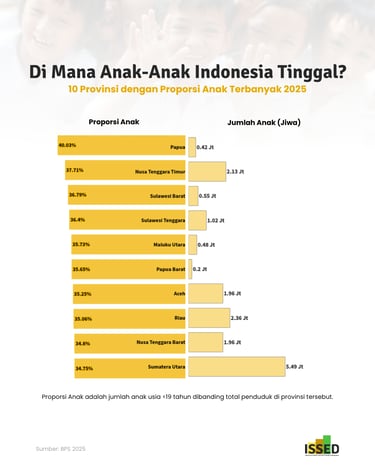 Data terbaru menunjukkan bahwa sepuluh provinsi dengan persentase anak tertinggi pada tahun 2025 sebagian besar berada di luar Pulau Jawa, khususnya di wilayah Indonesia bagian timur. Seluruh provinsi dalam daftar ini memiliki proporsi anak di atas rata-rata nasional sebesar 31,47%. Papua menempati posisi teratas dengan 40,03% penduduknya merupakan anak-anak.