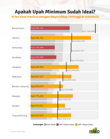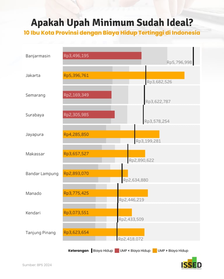 Lalu bagaimana jika UMP dijadikan penopang utama biaya rumah tangga? Sayangnya, tak satu pun dari sepuluh daerah dengan biaya hidup tertinggi menunjukkan kecukupan UMP untuk membiayai rumah tangga secara menyeluruh.
