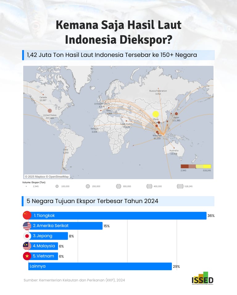 Tiongkok, sebagai produsen ikan terbesar di dunia, sekaligus menjadi importir utama komoditas perikanan Indonesia. Pada 2024, sekitar 36% (518 ribu ton) ekspor ikan Indonesia dikirim ke Negeri Tirai Bambu, dengan nilai mencapai USD 1,24 miliar.