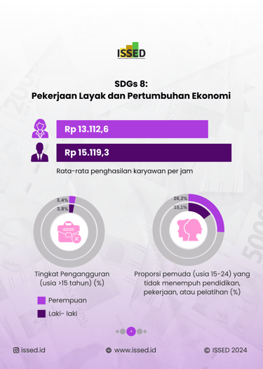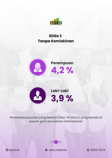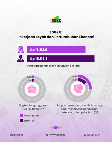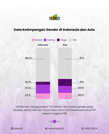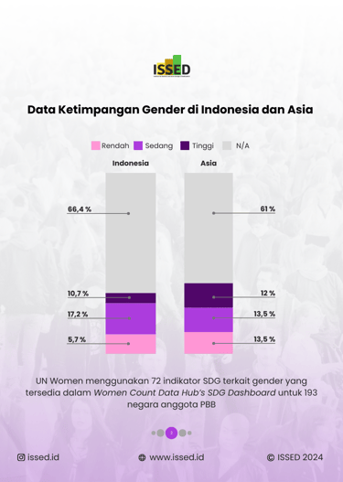 Mari kita merefleksikan kesenjangan dalam data gender pada indikator Tujuan Pembangunan Berkelanjutan (SDG). Per Desember 2020, hanya ada 33,6% indikator yang dapat digunakan untuk mengevaluasi SDGs dari perspektif gender. Dapat dilihat bahwa skor Indonesia masih berada di bawah rata-rata Asia untuk penilaian indikator gender SDG oleh UN Women. Jika dilihat dari indikator SDG 1: Tanpa Kemiskinan (No Poverty), populasi perempuan pekerja yang berada di bawah garis kemiskinan masih lebih tinggi dibandingkan laki-laki. Hal ini juga sejalan dengan SDG 8: Pekerjaan Layak dan Pertumbuhan Ekonomi (Decent Work to Economic Growth), dimana penghasilan rata-rata per jam karyawan perempuan lebih rendah dibandingkan laki-laki. Selain itu proporsi pemuda perempuan (usia 15-24 tahun) yang tidak menempuh pendidikan, pekerjaan atau pelatihan juga jauh lebih tinggi dibandingkan laki-laki.