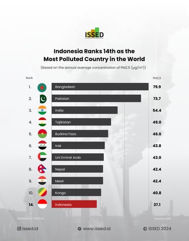 Indonesia continues to face serious challenges related to air pollution, especially in urban areas. Ranked the 14th most polluted country in the world in 2023, Indonesia has a high concentration of PM2.5 at 37.1 µg/m³. PM2.5 is one of the most dangerous air pollutants, as its tiny size can enter the lungs and cause a range of health problems, from respiratory disorders to cardiovascular disease. These findings show that despite efforts to reduce pollution, air quality in Indonesia is still a major concern, especially in large, densely populated cities.