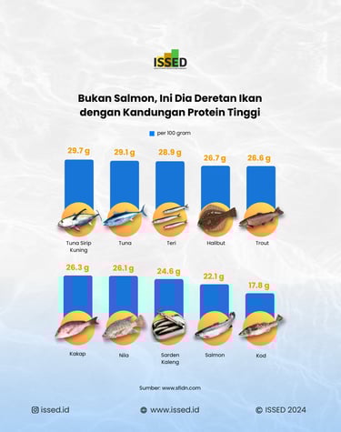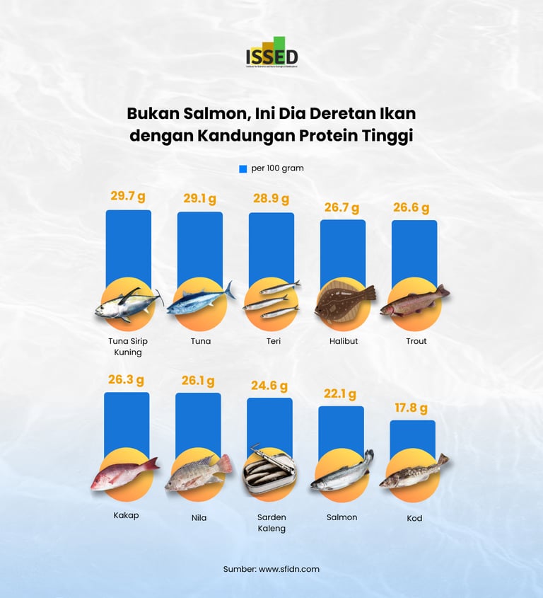 Salmon is one of the most popular proteins from the sea, often mentioned by health experts and food critics from all over the world for its nutritional value and versatility in recipes. But did you know that salmon is not the only high-protein fish? In fact, there are at least eight other fish varieties that pack a bigger protein punch! Take a look at this list of the top 10 fish based on protein per 100 grams. Topping the list is Yellowfin Tuna (Tuna Sirip Kuning) with an impressive 29.7 grams of protein, closely followed by regular Tuna at 29.1 grams and Anchovies (Teri) at 28.9 grams. These fish not only provide substantial protein but also offer a range of other health benefits essential for a balanced diet.