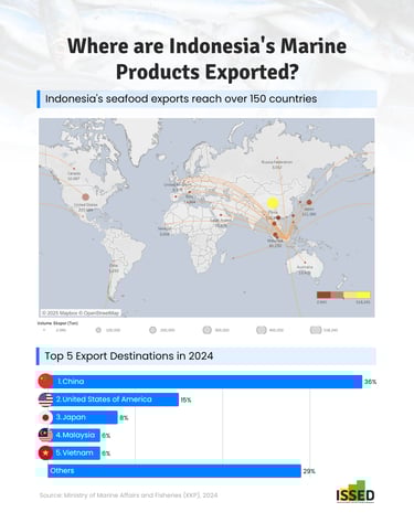 With an expanse of ocean spanning 3.25 million km² — around 62% of the country's total area — Indonesia is blessed with an extraordinary abundance of marine resources. Home to thousands of species of fish and other marine life, Indonesia is one of the world's largest producers of seafood. Although Indonesia is not among the top 10 global fish exporters, Indonesian seafood has reached international markets, including Asia, America, and Europe.